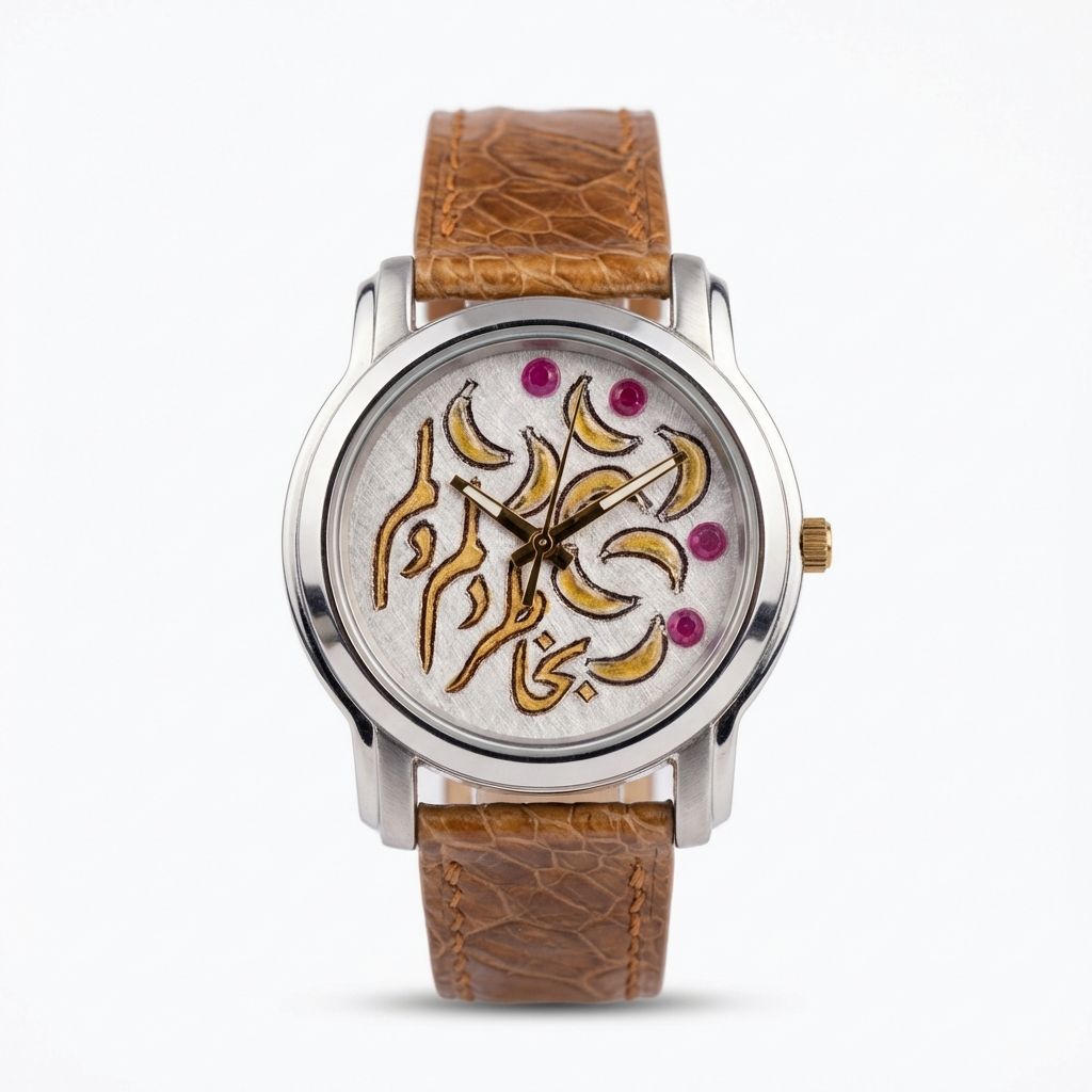 Enamel work, silver dial, Ruby stones, gilding, strap made of ostrich leg leather, automatic movement.”