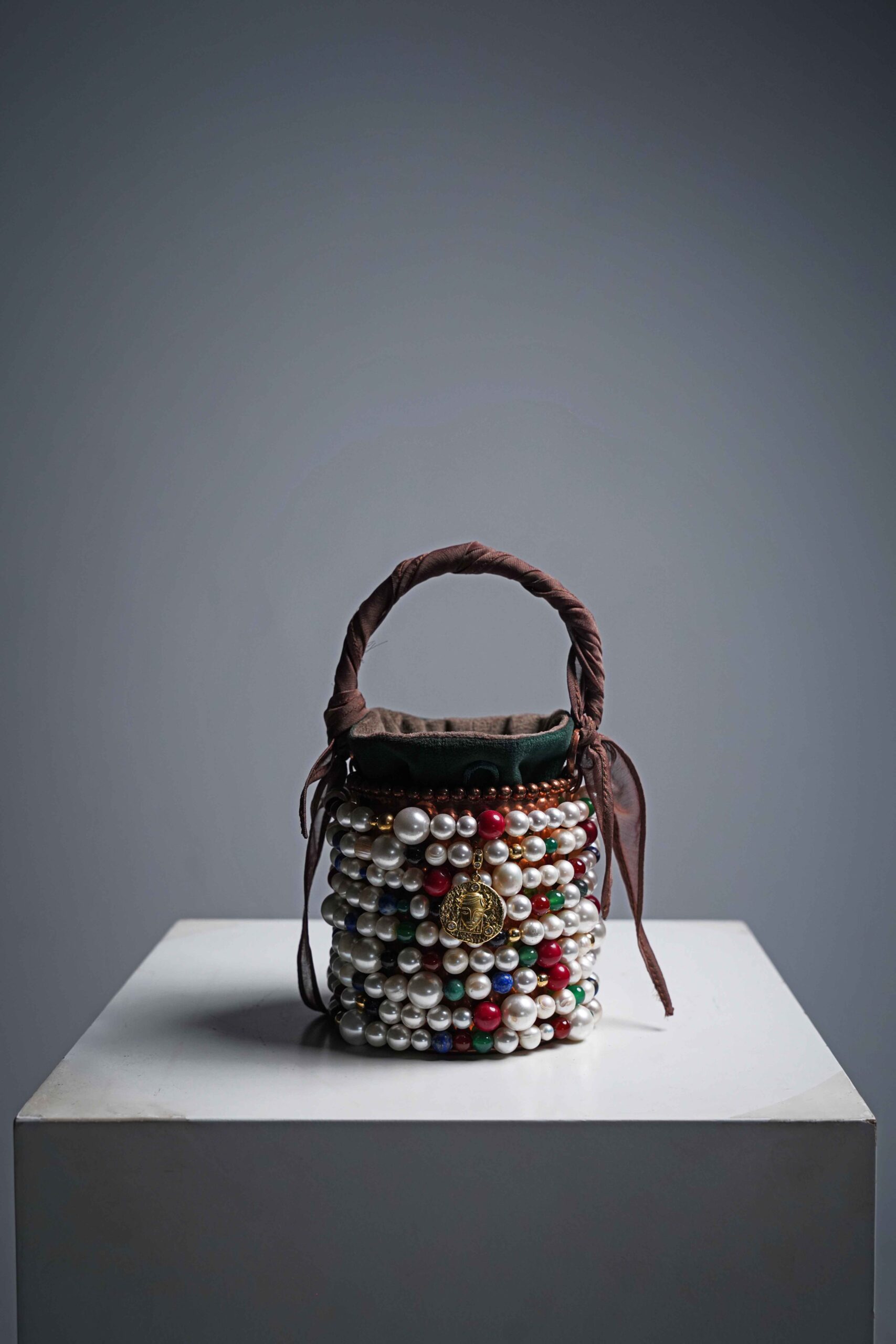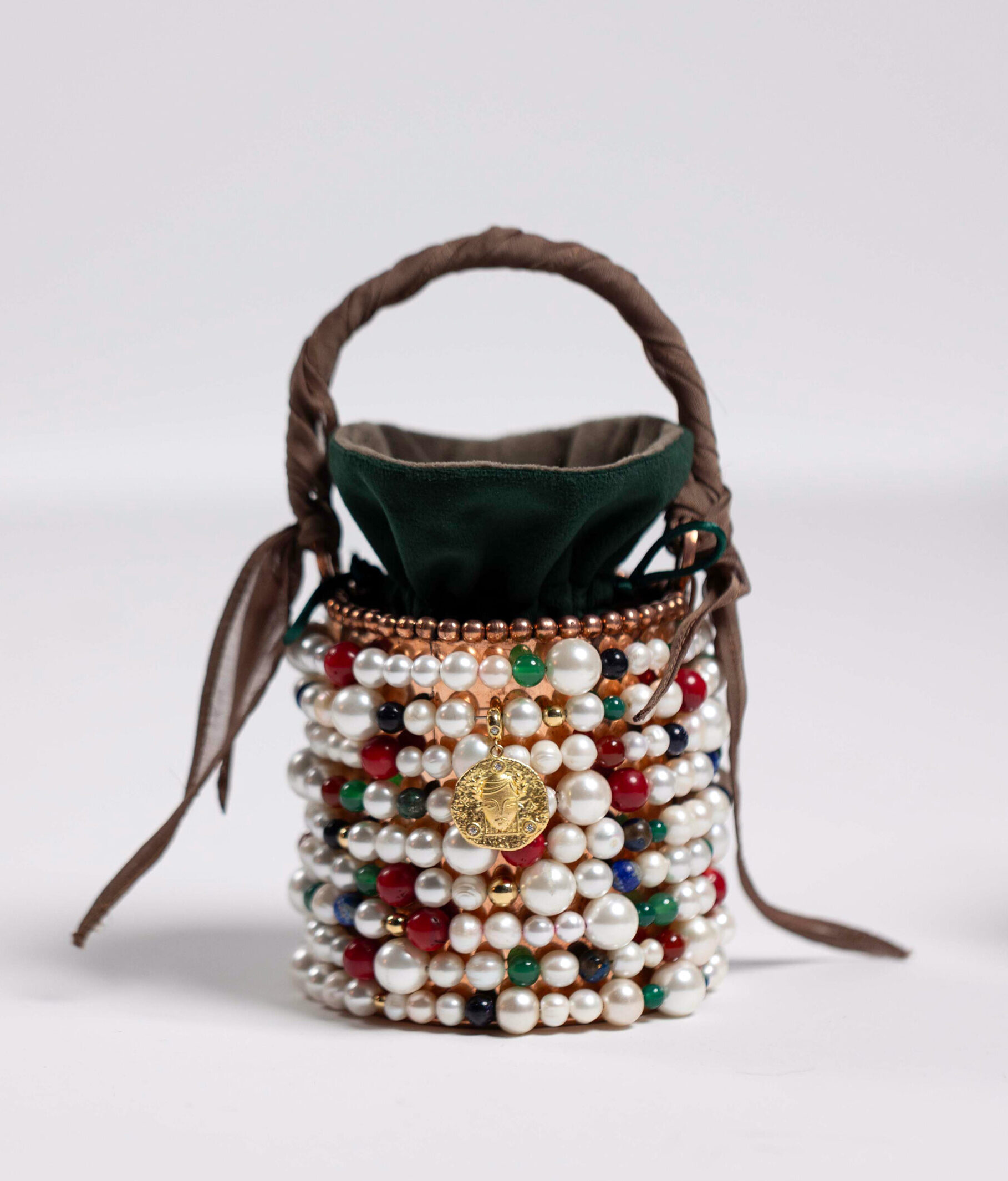 Material:Captivating aventurine, tiger’s eye, coral, azurite, fire jasper, and natural pearl and a Crafted from 18-karat gold, each piece contains over 10 grams of pure gold, shaped into a golden sphere and a zodiac-inspired pendant, uniquely designed for each bag. Unique edition