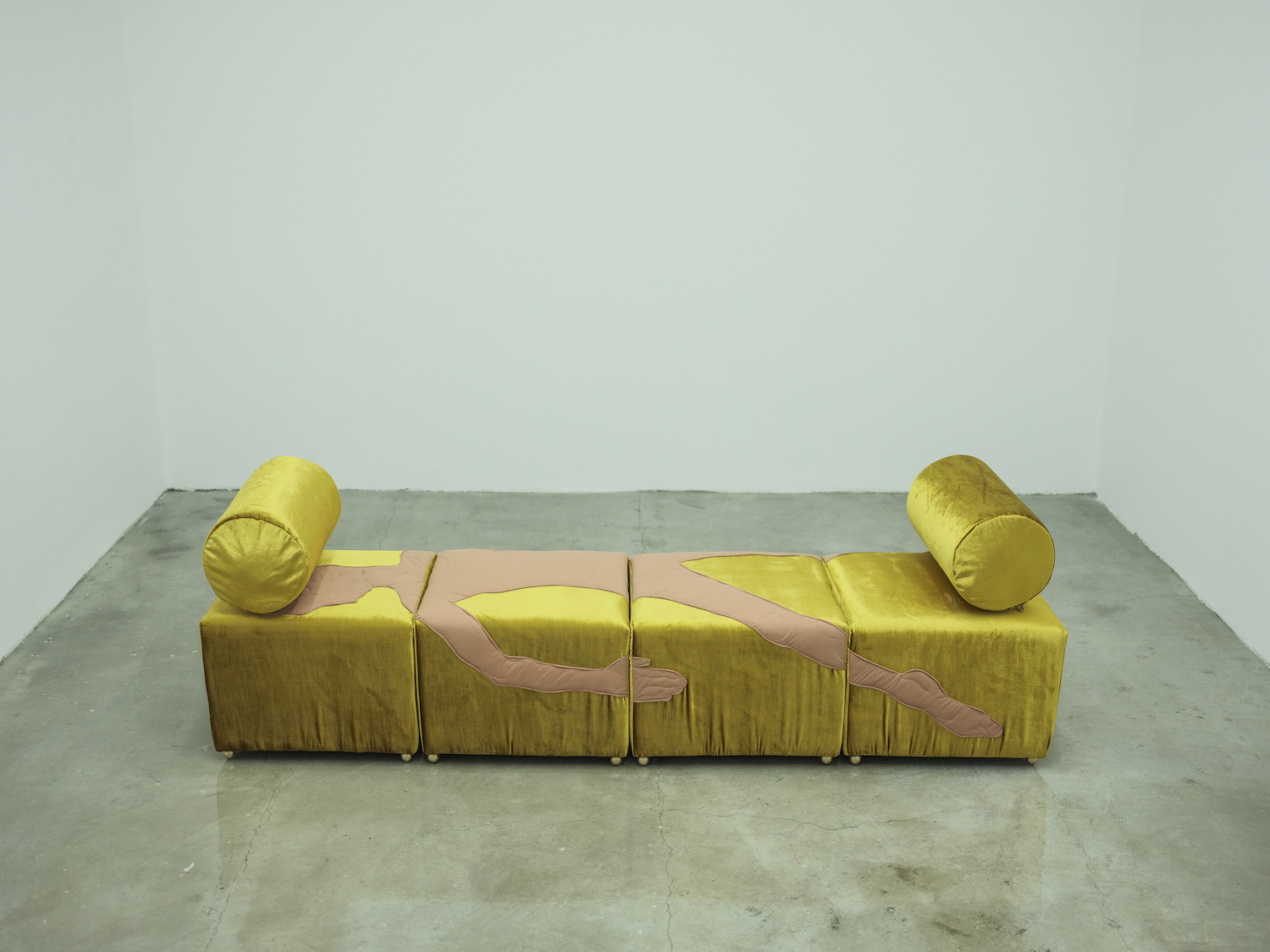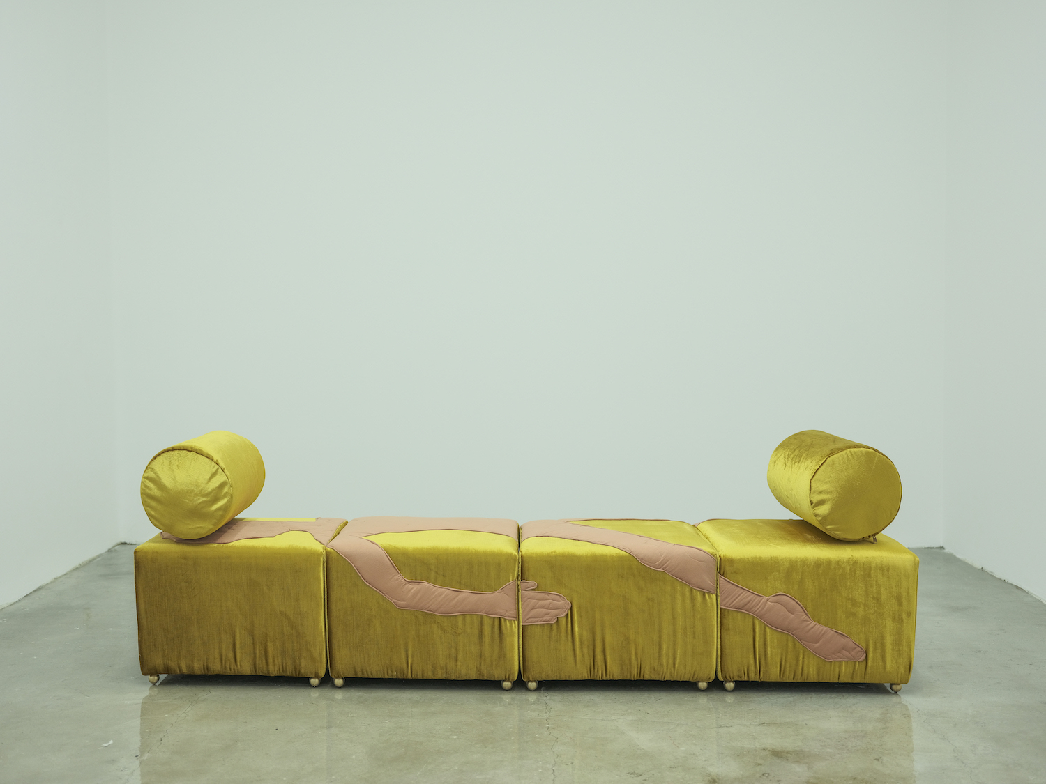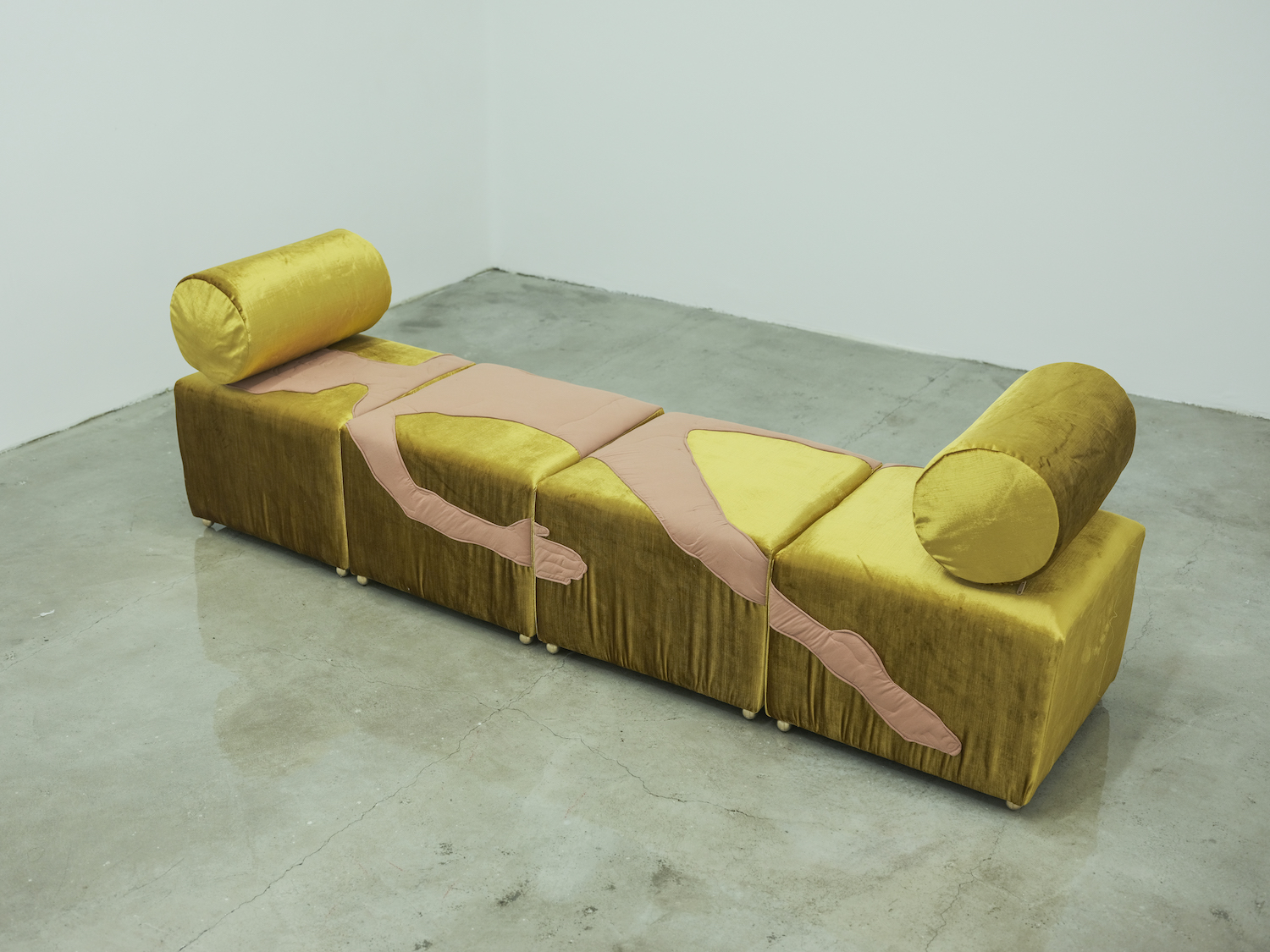 Sofa: Crushed velvet fabric – 38×200×50cm – each puff 38×50 cmBody: Cotton fabric, glass wool – 214×100cm